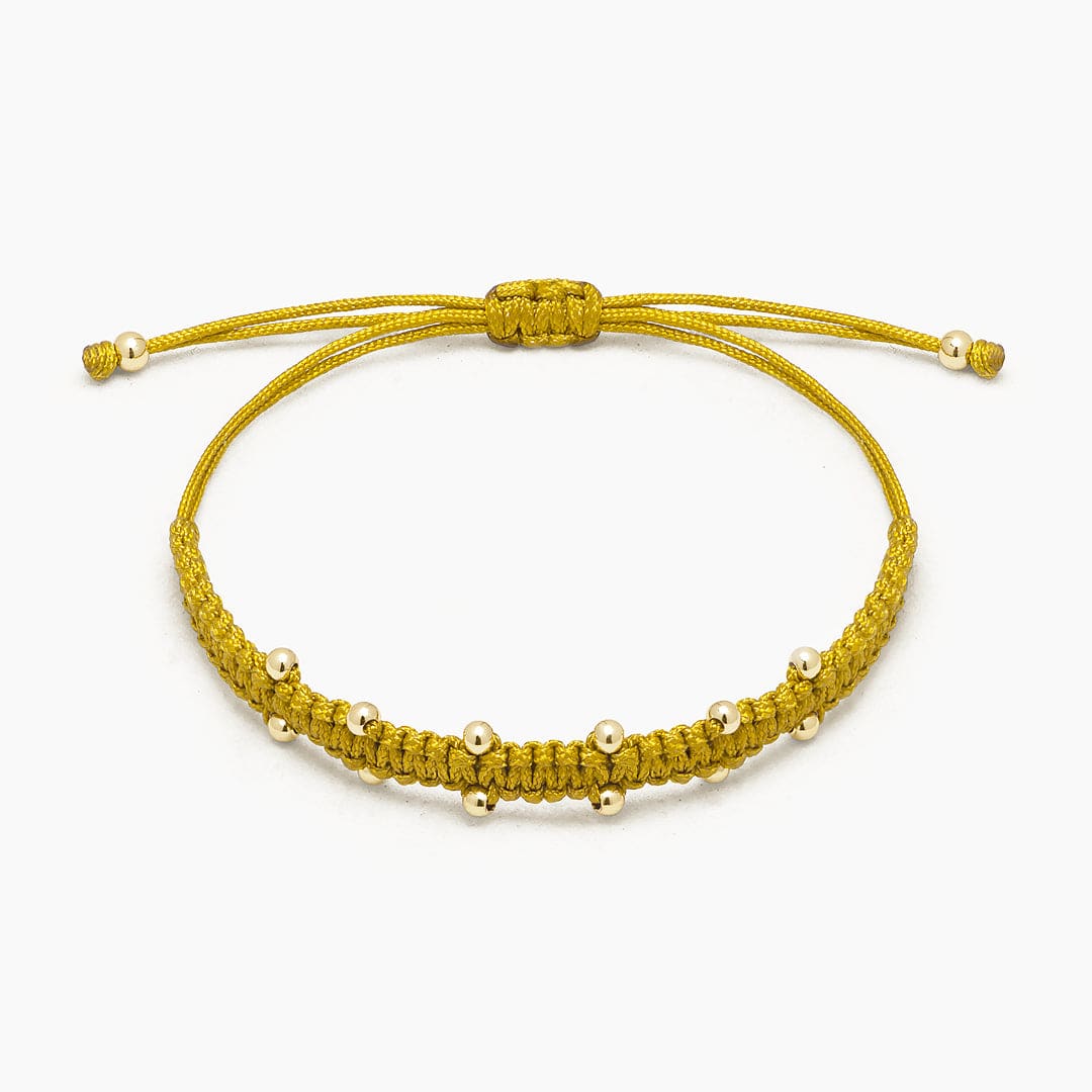 Material: Tejida a mano con hilo de seda y dije de cobre. Acabado: Baño de Oro 18k. Sistema de Cierre: Regulable