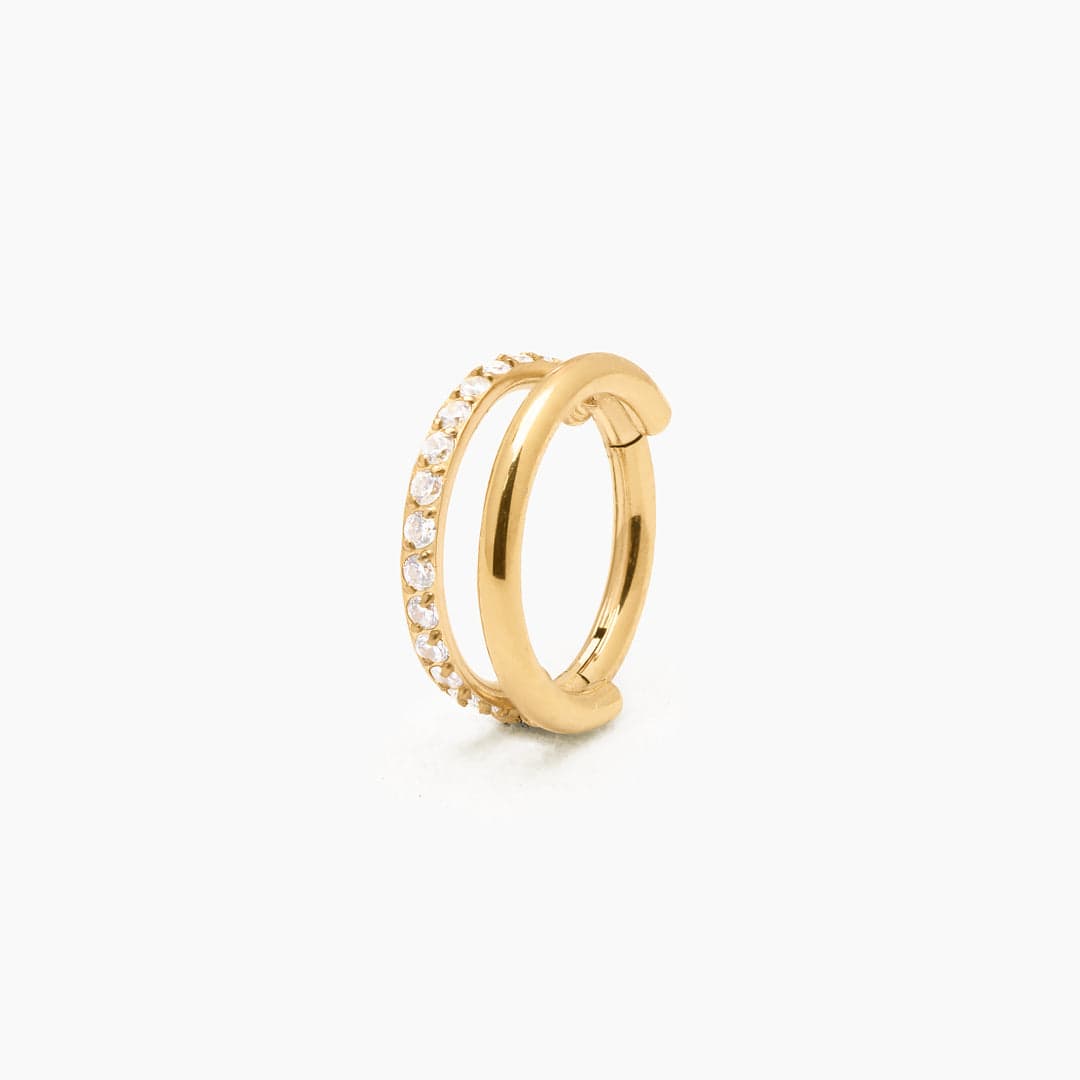 Material: Titanio Grado Implante F136. Piedras: Zirconia Cúbica 5A. Revestimiento: PVD Oro 18K. Cantidad: Unidad. Diámetro Interno: 8mm. Grosor Barra (Gauge): 1.2mm. Tipo de Cierre: Clicker. Zona para Usar: Daith, Hélix y Septum. Anodizado: No apto. Los piercing con recubrimiento de oro no deben anodizarse
